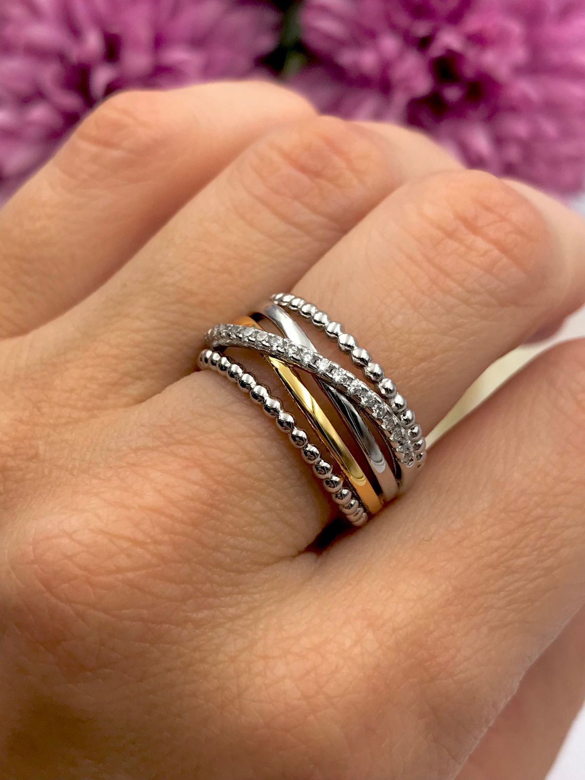 Anillo en plata de ley rodiada combinada con chapado en oro, varias tiras entrecruzadas, una de ellas con circonitas engastadas. Una pieza para lucir en cualquier momento y evento. Un modelo ancho que será el centro de todas las miradas