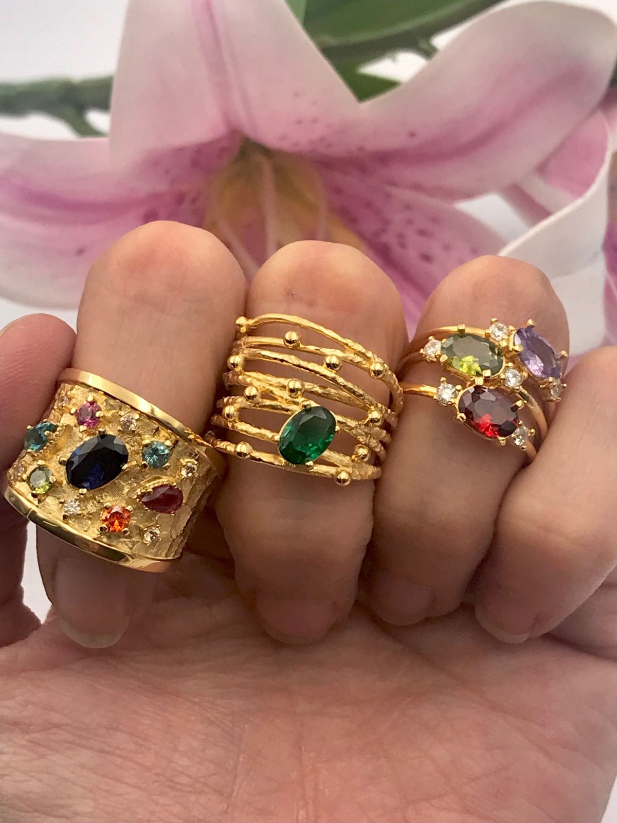 Anillo fabricado artesanalmente en plata de ley chapado en oro, acompañado de circonitas de color engastadas, un festival de colores que te darán alegría. Con posibilidad de modificaciones (consultar).Todas las tallas bajo encargo.