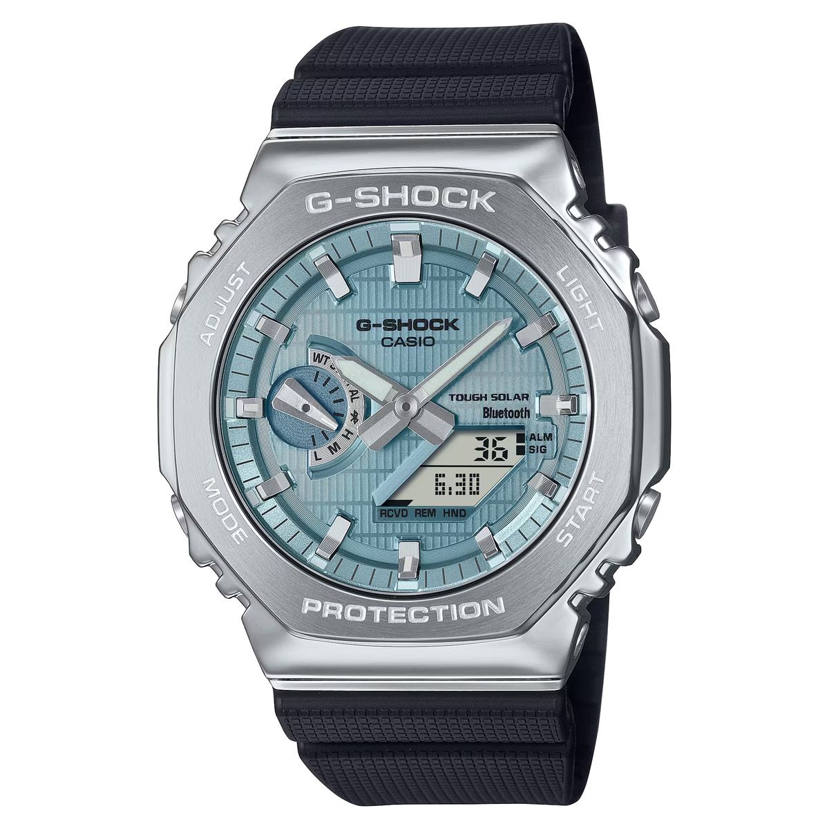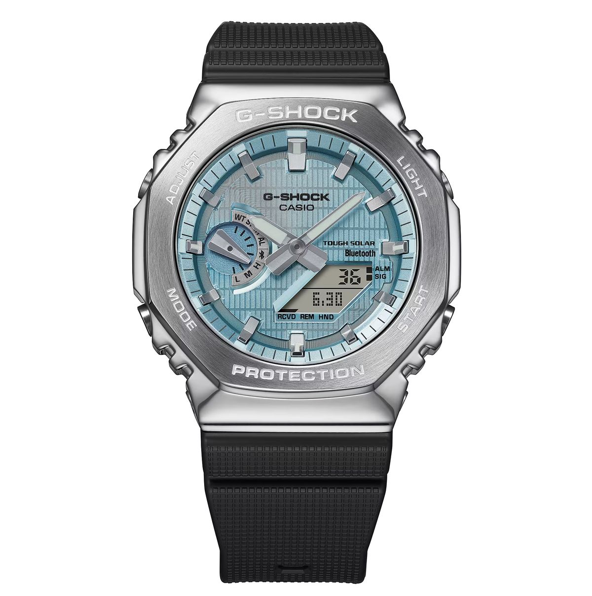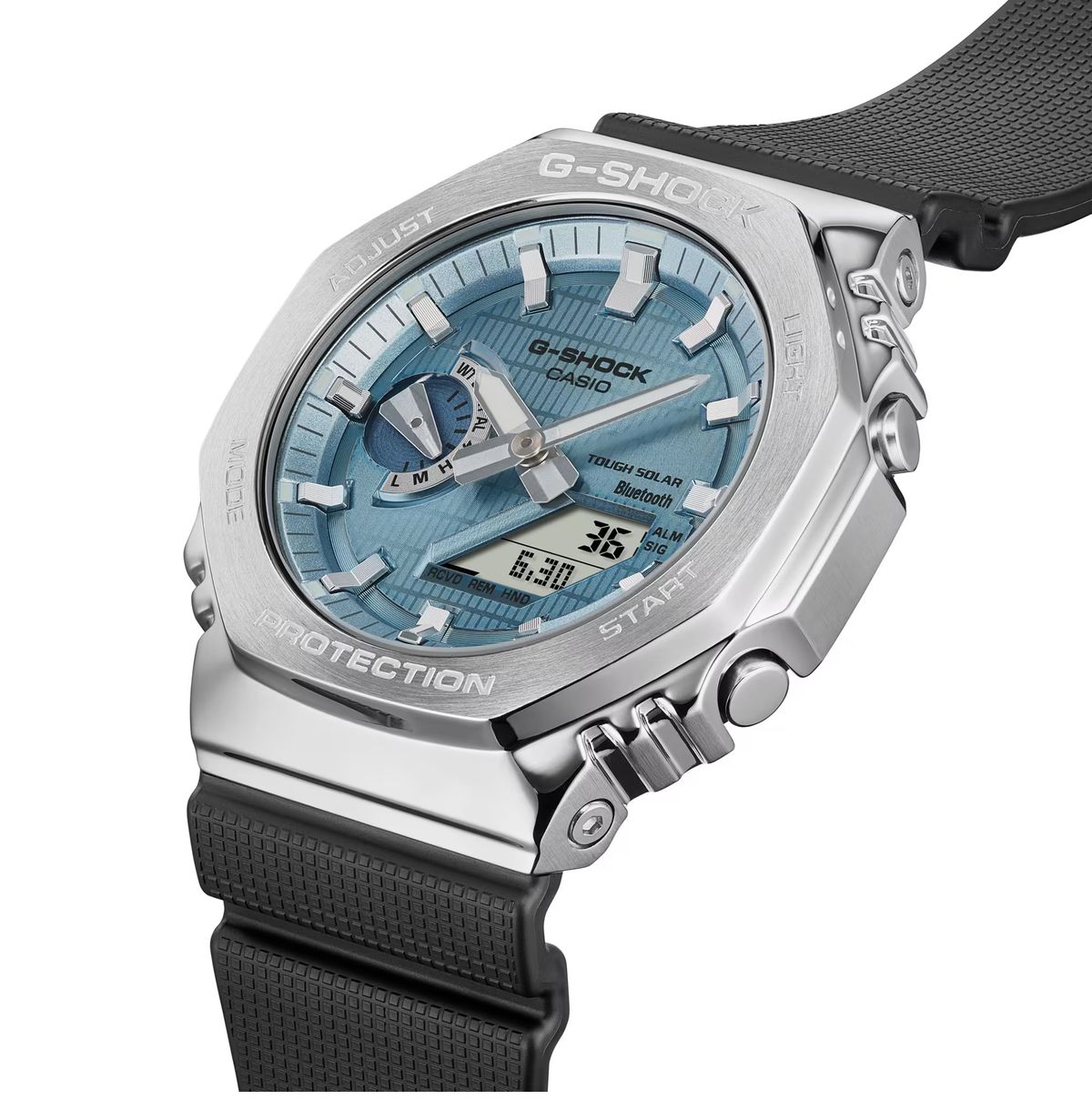 Stoßfest, Timer, Stoppuhr, 5 Alarme, Weltzeit, Dual-Illuminator... Gefertigt mit einer Lünette aus Edelstahl und einem Innengehäuse aus glasfaserverstärktem Harz zum Schutz des Moduls, einem äußerst robusten Armband aus Bioharz und einem hellblauen Zifferblatt. Sie verfügt über Bluetooth®-Smartphone-Kopplung und Tough Solar-Ladefunktion. Eine großartige Uhr für jeden Anlass.
