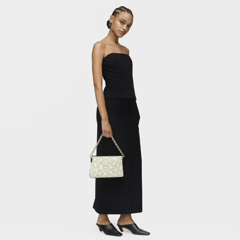 Tous-Clutch aus der Kaos Icon-Kollektion aus bedrucktem Canvas in Beige und Grau mit synthetischen Fußdetails. Es wird mit einem Reißverschluss geschlossen und verfügt über einen abnehmbaren Goldkettengriff, der an der Schulter oder an der Hand getragen werden kann. Es wird zu Ihren Favoriten gehören.