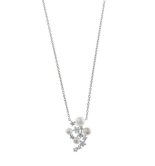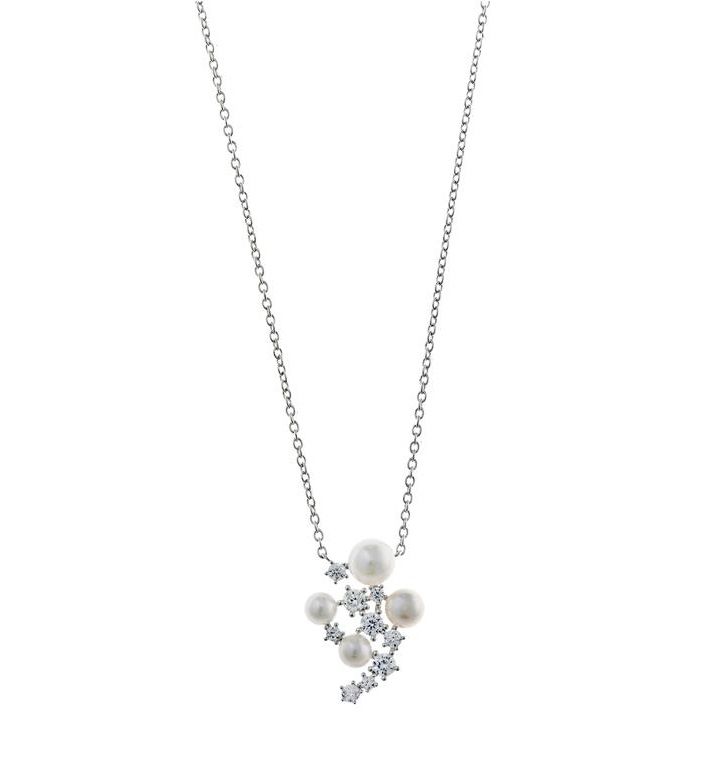 Colgante fabricado en plata de ley con acabado rodiado, con perlas cultivadas y circonitas engastadas. La elegancia volcada en una pieza sublime.
