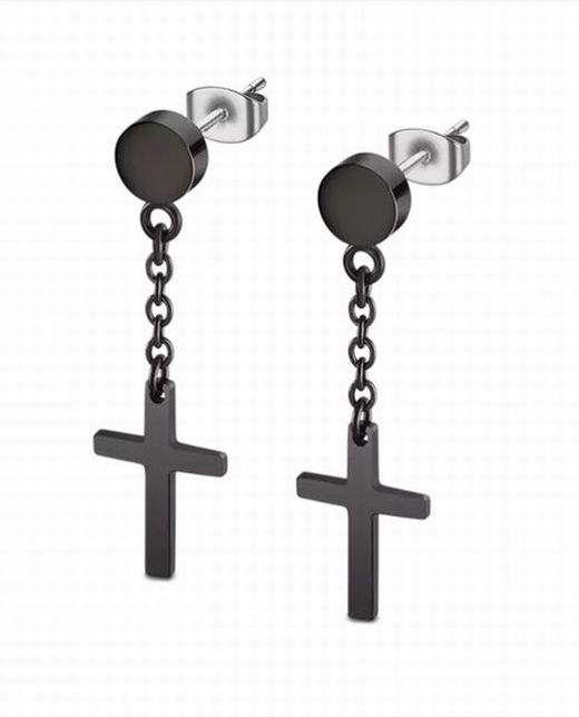 Lange Lotus-Ohrringe aus schwarzem Edelstahl mit IP-Finish, mit einer Kette und einem Kreuz am Ende. Wenn Sie auf dem neuesten Stand sein möchten, sind dies Ihre Ohrringe.
