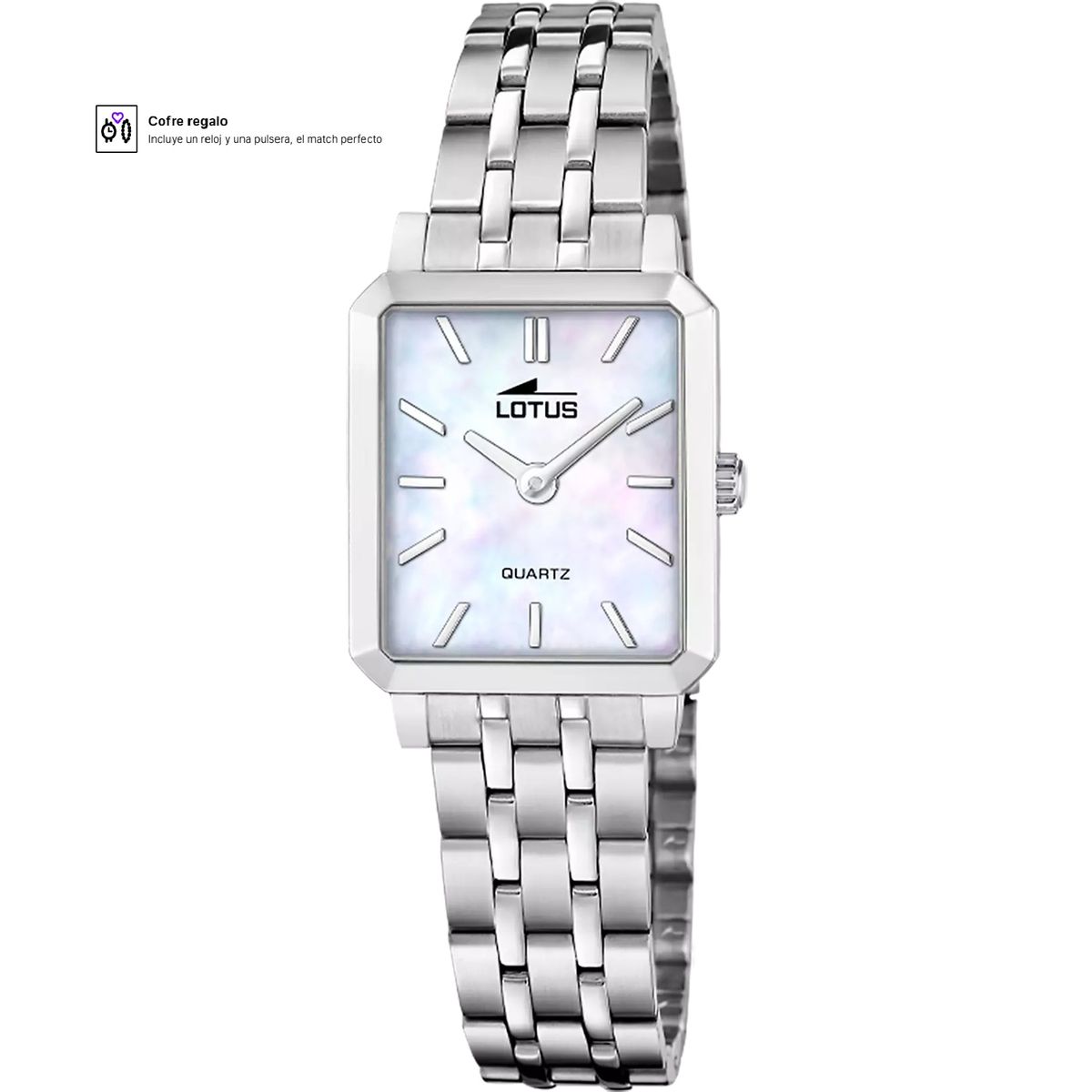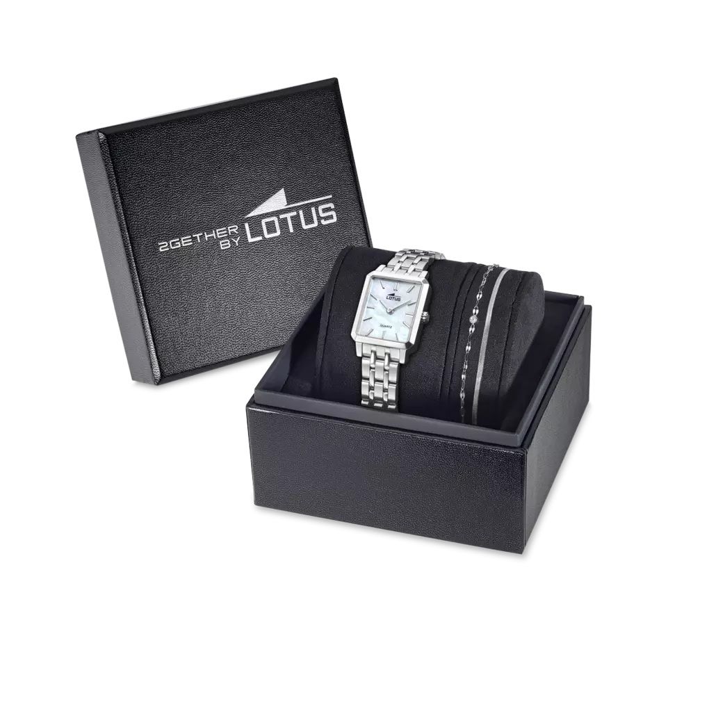 Die Lotus Damenuhr aus der Together Kollektion. Gefertigt aus Edelstahl mit einem Perlmuttzifferblatt. Ihr rechteckiges Design verkörpert dezenten, raffinierten Luxus. Präsentiert in einer eleganten Geschenkbox mit passendem Armband, ist sie ideal für alle, die exklusive Details zu schätzen wissen.