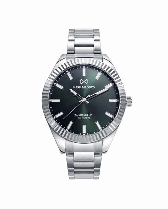 Mark Maddox Herrenuhr aus Edelstahl mit grünem Zifferblatt und Aluminiumlünette. Sehr bequem und leicht zu tragen.