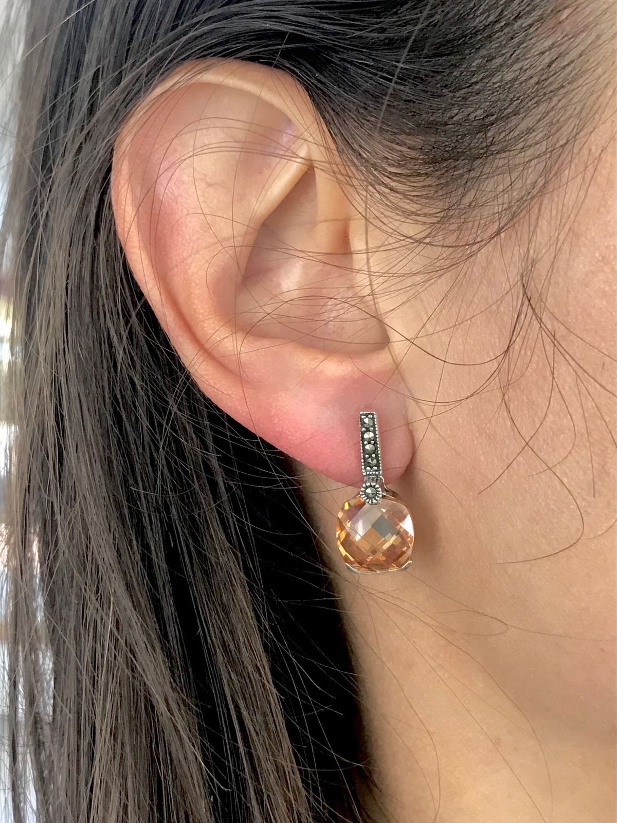 Pendientes fabricados en plata de ley con forma cuadrada. Un detalle de marquesitas acompañado de una circonita de color ámbar, siendo la protagonista de la pieza.