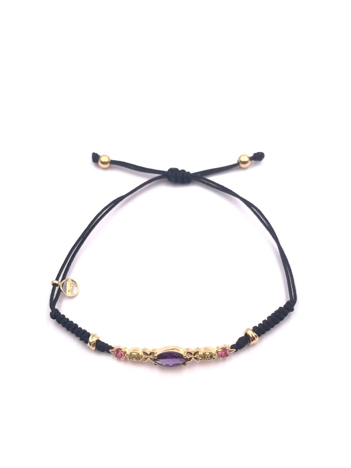 Pulsera en plata de ley chapada en oro con circonita central en color verde en forma de lanzadera, combinada con circonitas de varios colores, fabricada a mano con nudo serpiente en nylon de color negro. Muy combinable con pulseras del mismo modelo y distinto color. Ajustable a todas las medidas gracias a su nudo corredizo.