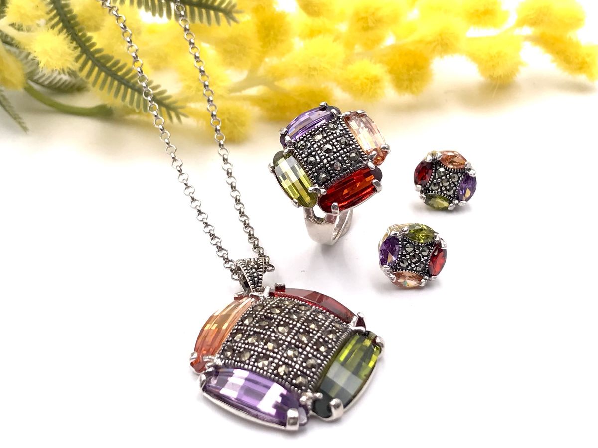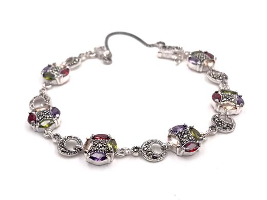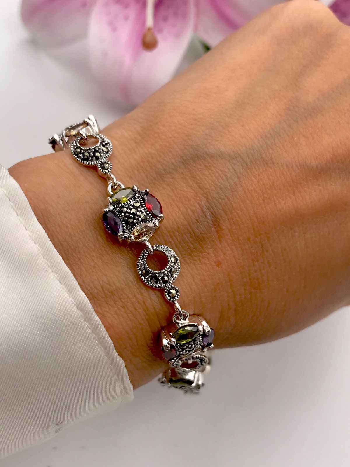 Pulsera fabricada en plata de ley, envejecida, acompañado de marquesitas y circonitas de color. Un aire vintage modernizado gracias al color. Un pulsera elegante para la mujer de hoy en día. Con cadena de seguridad.