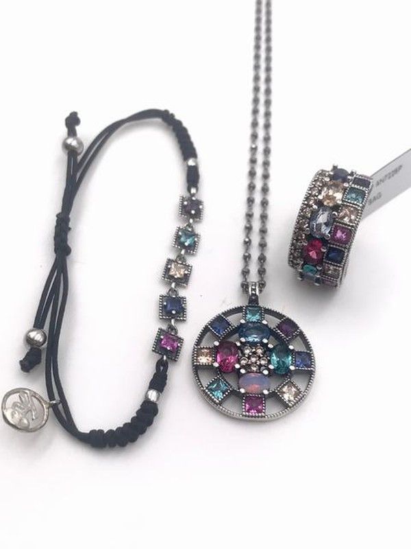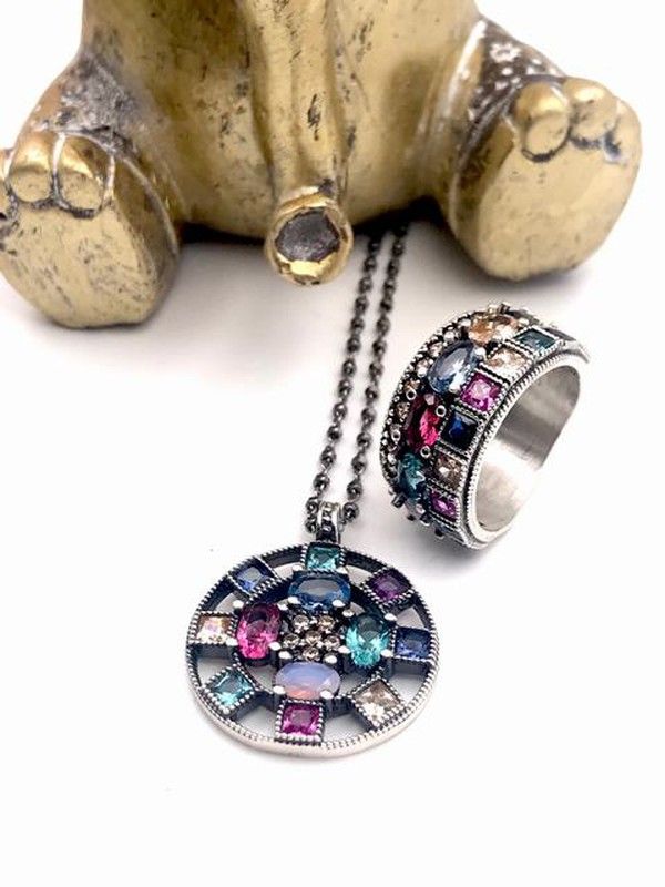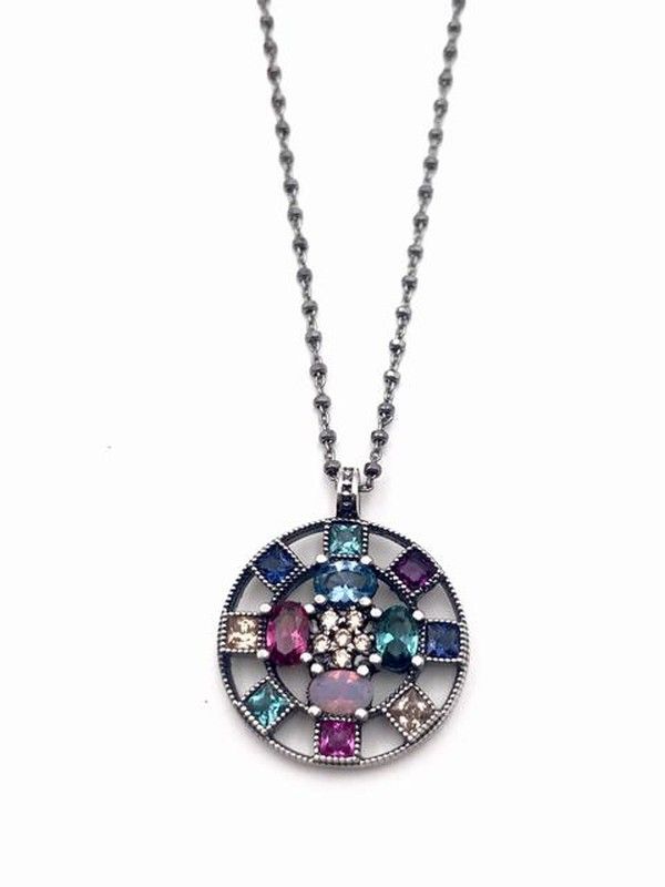 Anhänger aus Sterlingsilber mit Cava-Zirkonen, umgeben von Nanoedelsteinen in verschiedenen Farben. Kette aus rhodiniertem Sterlingsilber, die ihr einen Vintage-Touch verleiht. Entworfen und hergestellt in Spanien. Mit der Möglichkeit von Änderungen (konsultieren).