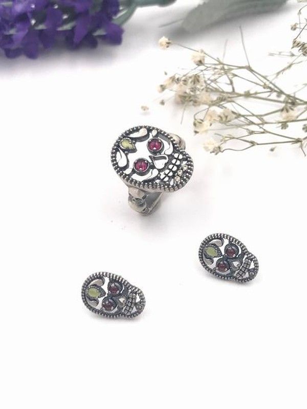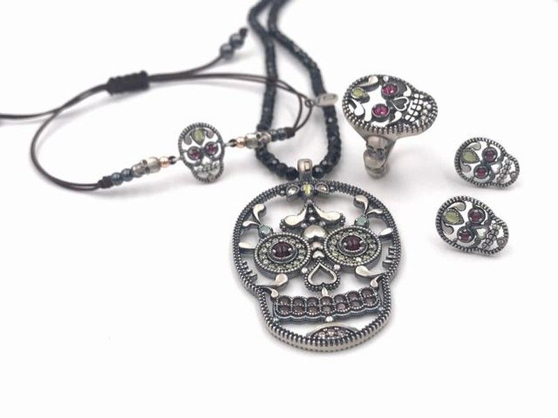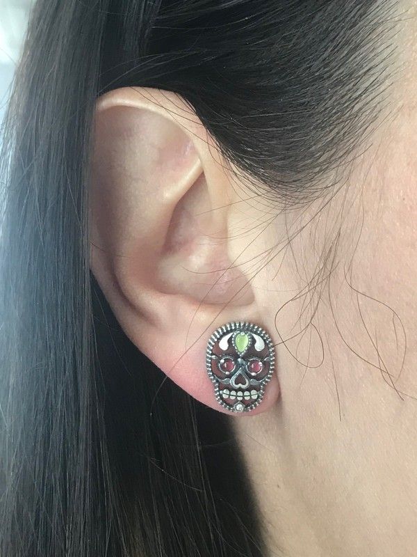 Ohrringe aus gealtertem Sterlingsilber in Form eines durchbrochenen Totenkopfes mit Halbedelsteinen, Granat und grünem Katzenauge. Design in Spanien 100 % handgefertigt. Abweichungen können die Lieferung verzögern.