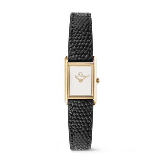 Reloj Daniel Wellington, fabricado en acero inoxidable Ip dorado, de la colección Bound, con correa de piel texturizada en color negro. Una versión compacta del reloj rectangular, con caja delgada y una esfera blanca impecable se combinan con una correa de malla dorada para un look moderno y desenfadado.