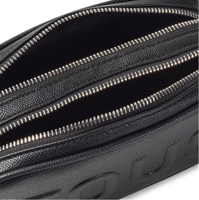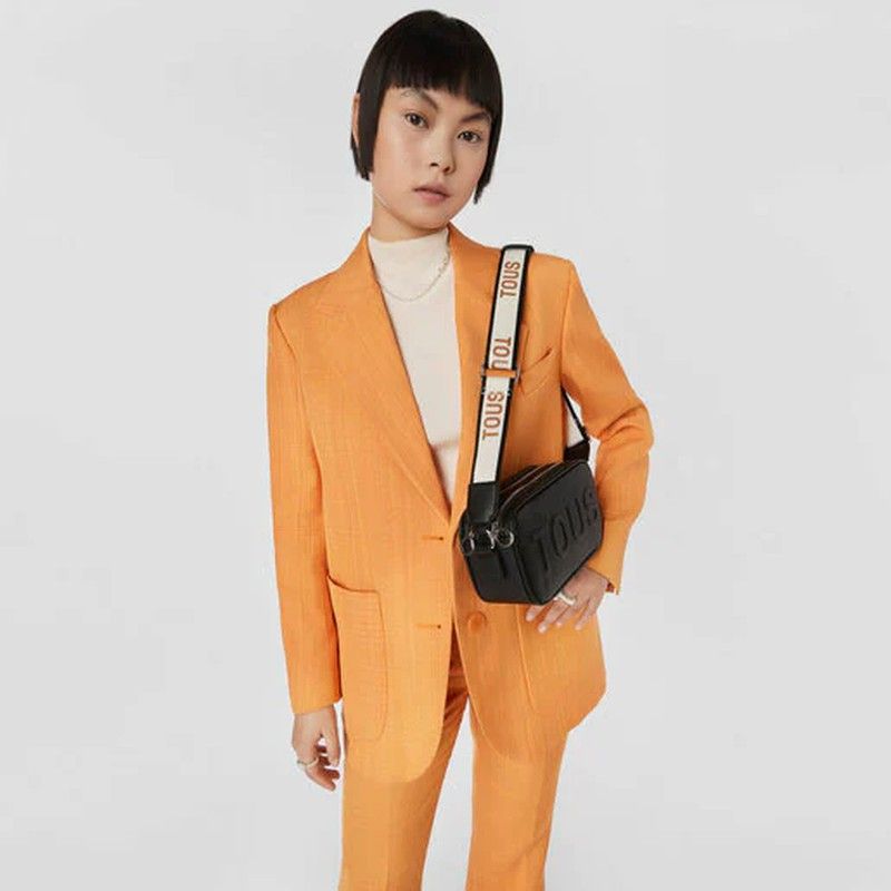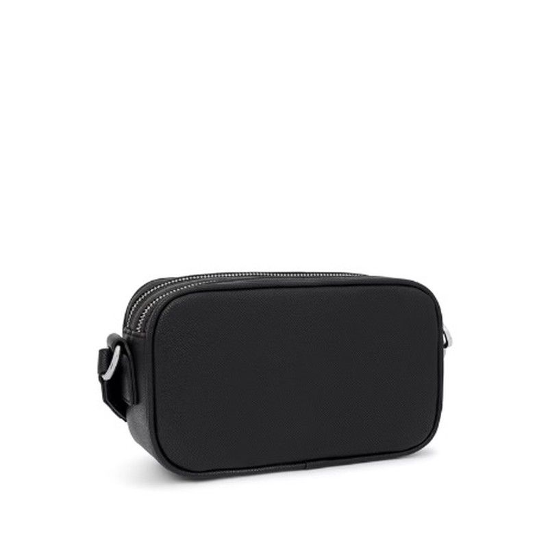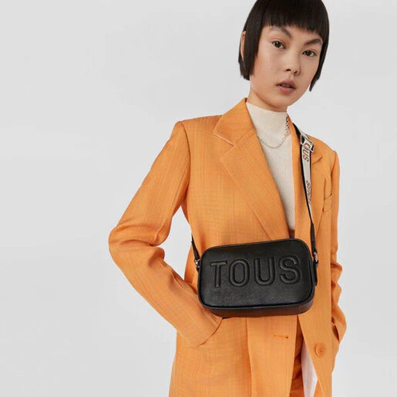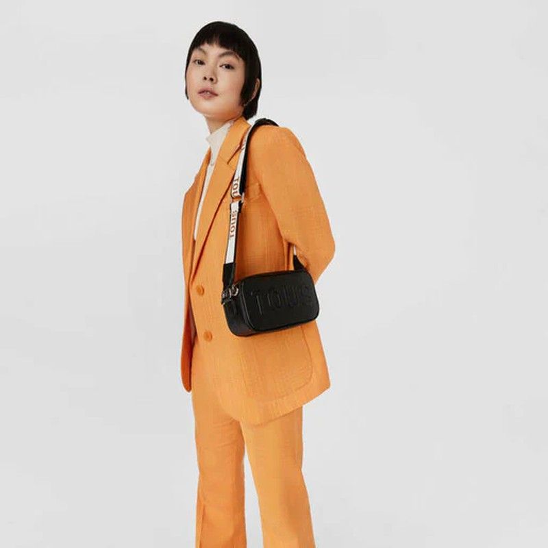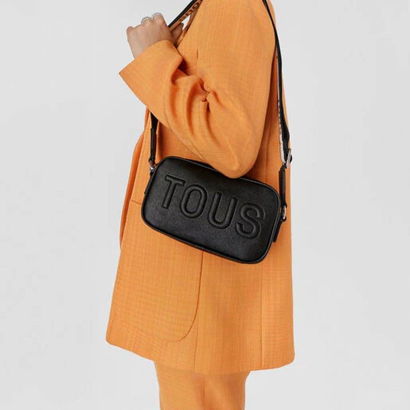 Tous Reporter-Umhängetasche aus der La Rue-Kollektion aus Kunstleder mit Saffiano-Finish in Schwarz. Es verfügt über zwei unabhängige Räume, die mit einem Reißverschluss verschlossen sind, und einen verstellbaren, abnehmbaren Griff mit einem Haken zum Aufhängen einer Verzierung, beispielsweise eines Schlüsselrings. kompakt und komfortabel