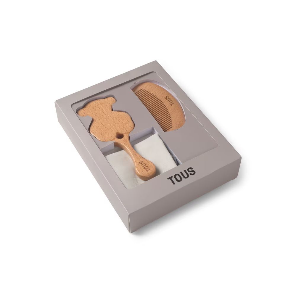 Set de Cepillo y Peine Tous en madera natural, cepillo con forma de osito, con puntas redondeadas y suaves filamentos para asear y cuidar al bebe, sin dañar su delicada piel y cabello. Con una práctica funda para poder llevarlos siempre contigo.