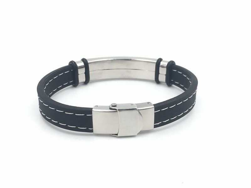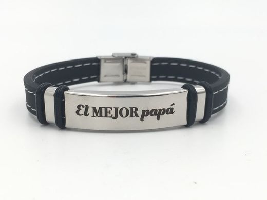 Armband aus Stahl und schwarzem Silikon mit weißen Nähten, speziell für Papa mit Gravur: The Best Dad.