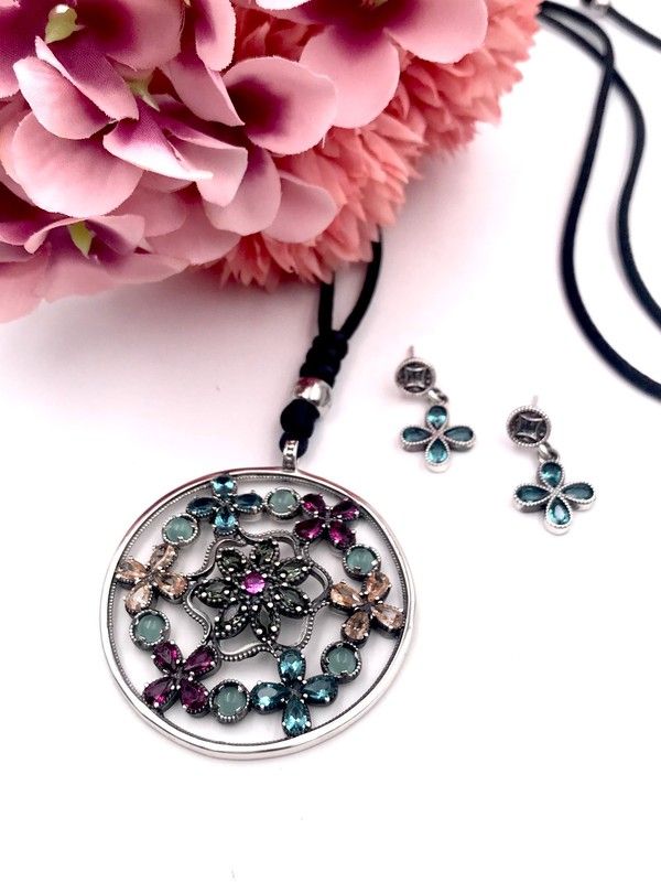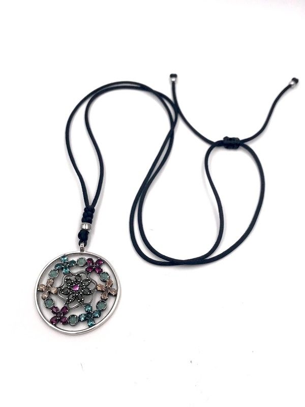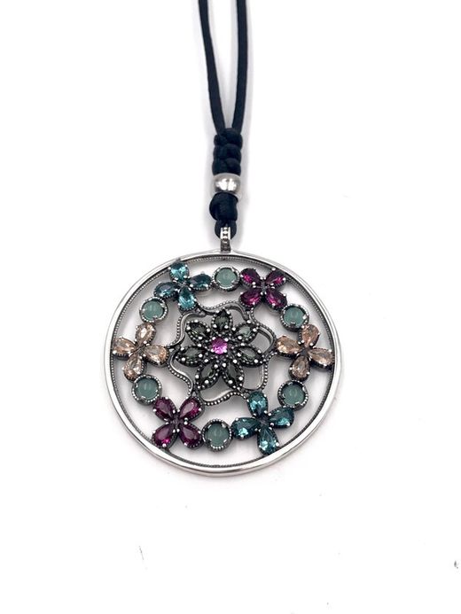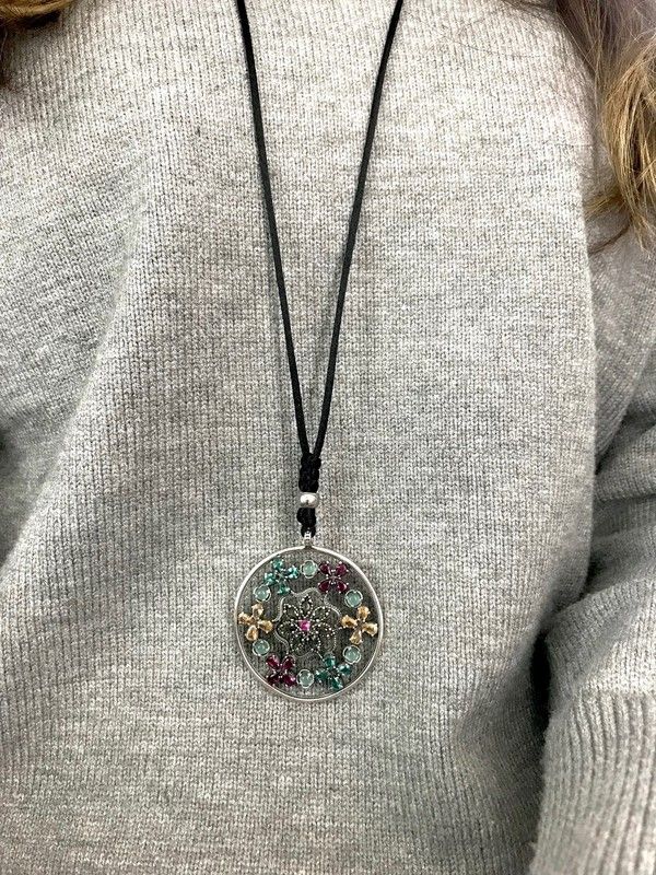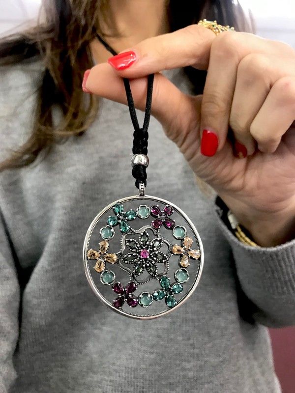 Langes Medaillon, handgefertigt aus antikem Sterlingsilber mit hochwertigem Chalcedon und Zirkonen in verschiedenen Farbtönen, die ihm Leben und Leuchtkraft verleihen. Eine Seidenkette mit verstellbarem Verschluss ermöglicht die Wahl der Höhe des Anhängers. Entworfen und hergestellt in Spanien. Änderungen sind möglich (bitte anfragen).