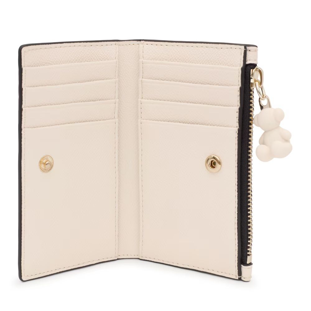 Die Geldbörse „Tous“ aus der Brenda-Kollektion ist aus beigefarbenem Polyurethan gefertigt. Sie wird mit einem Druckknopf geschlossen und bietet acht Kartenfächer, zwei Geldscheinfächer und ein Münzfach mit Reißverschluss. Ein 3D-Bärenmotiv ziert den Reißverschlussanhänger. Kombinieren Sie sie mit einer Handtasche aus derselben Kollektion!