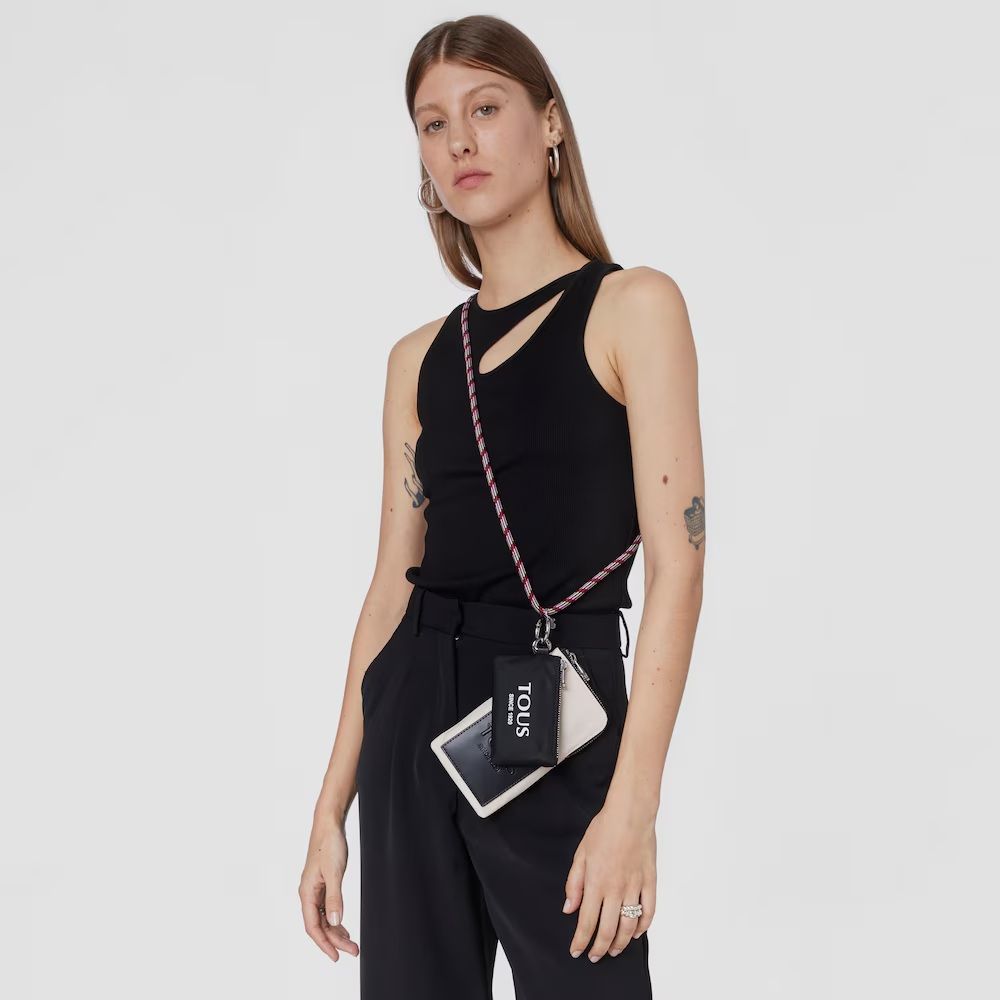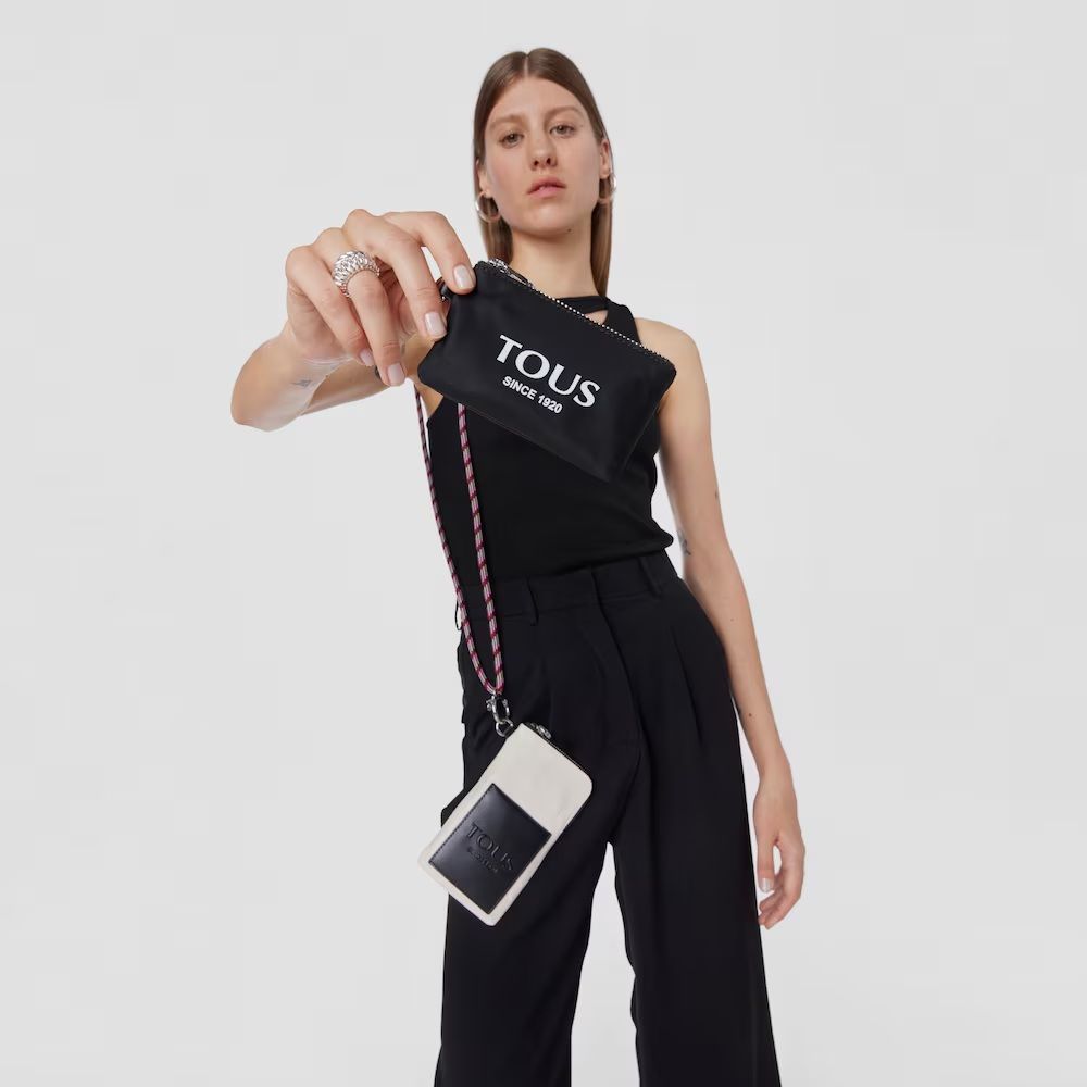 Handyhülle und Mini-Tasche von TOUS aus der Empire Soft-Kollektion aus recyceltem Nylon in Nude und Schwarz. Reißverschlüsse. Der Handyhalter verfügt über eine flache Außentasche und einen langen Kordelzug. Mini-Tasche mit Haken und abnehmbarem Ring.
