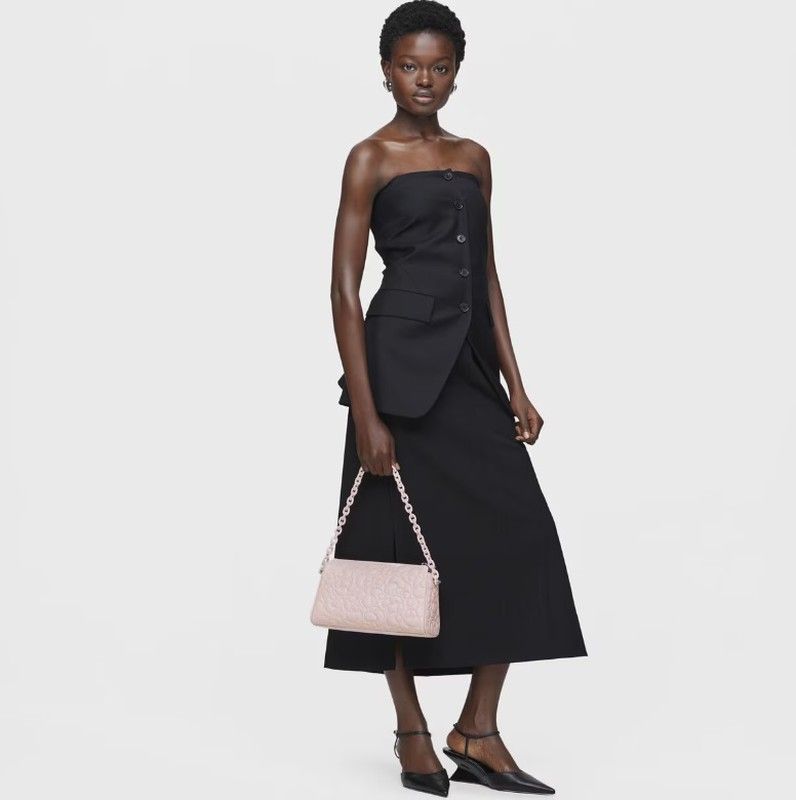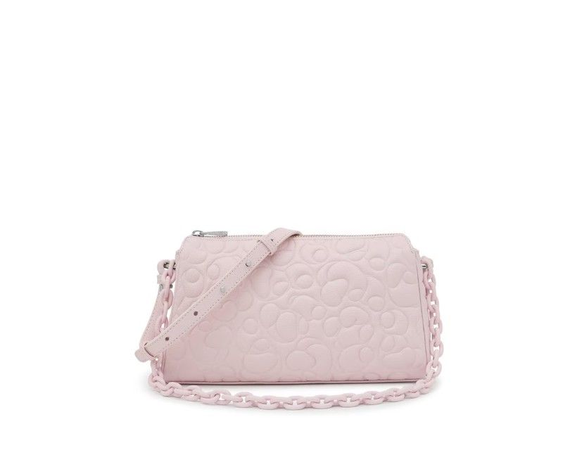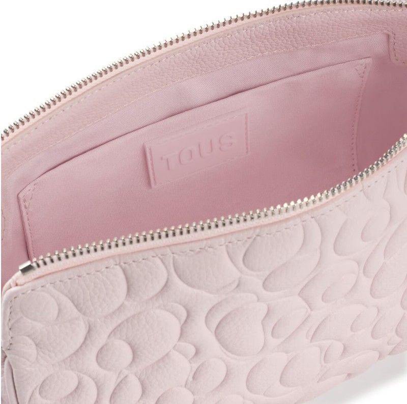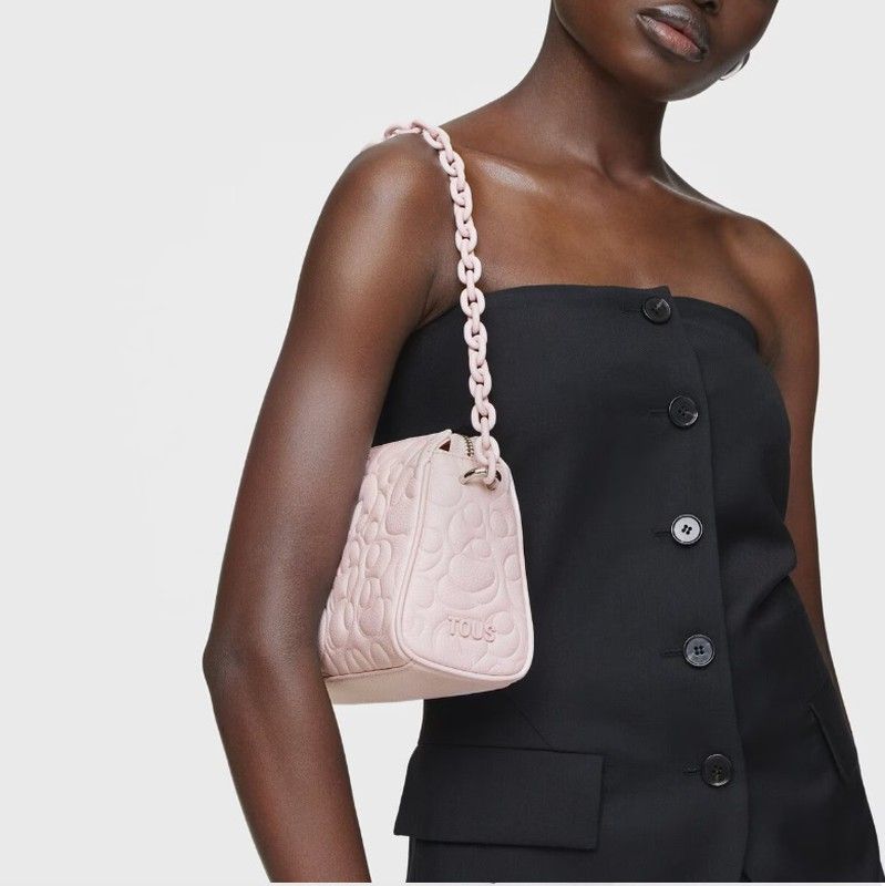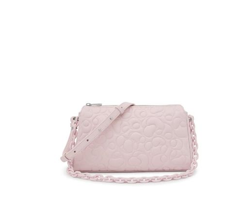 Tous Umhängetasche aus der Greta-Kollektion aus LWG-zertifiziertem Leder in Hellrosa. Es hat einen festen Griff in Form einer rosafarbenen Kette an der Schulter und einen abnehmbaren und verstellbaren Griff. Im Inneren befindet sich eine offene, flache Tasche. Das Leder ist elegant graviert, eine sehr süße Tasche, in die Sie sich verlieben werden.