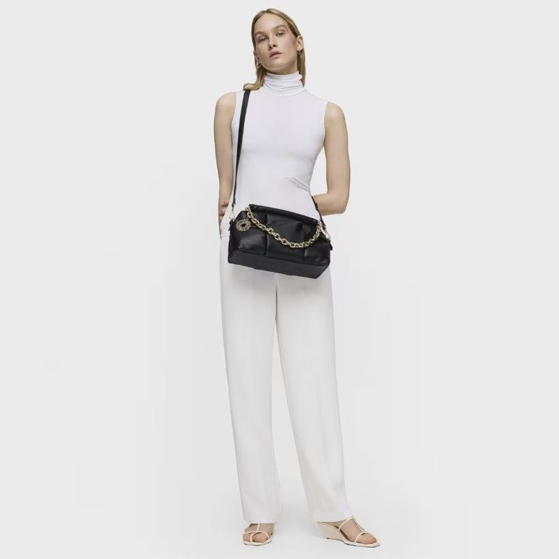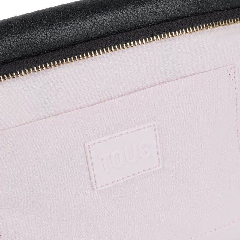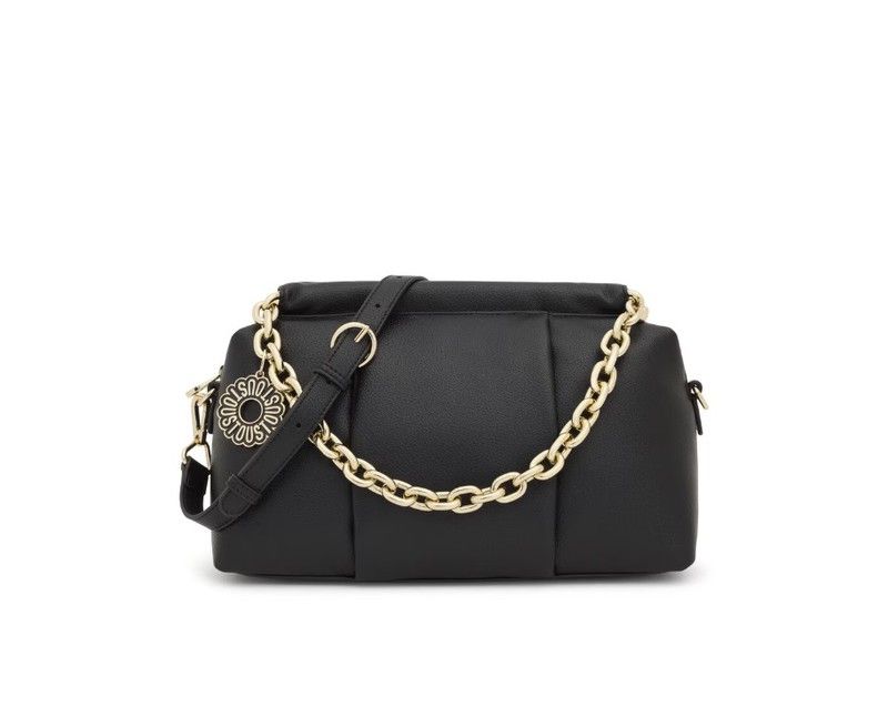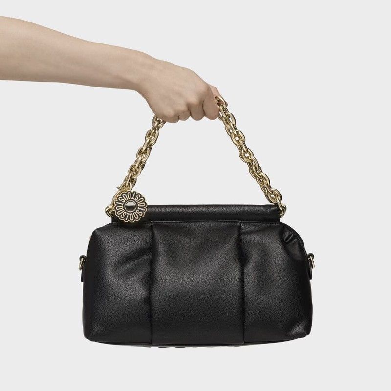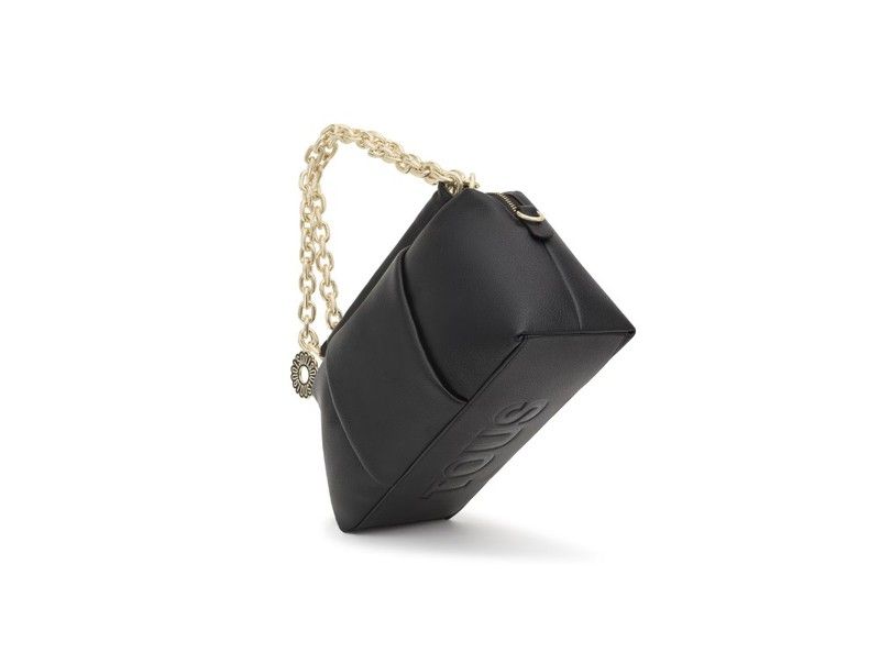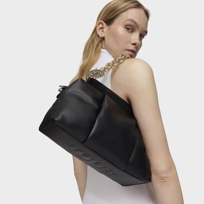 Mittelgroße Umhängetasche aus der Tous Jane-Kollektion aus schwarzem Kunstleder. Sie wird mit einem Reißverschluss geschlossen und verfügt über eine flache Innentasche, feste Griffe und einen verstellbaren und abnehmbaren Umhängegurt, der dank der goldenen Details einen raffinierten Touch verleiht.