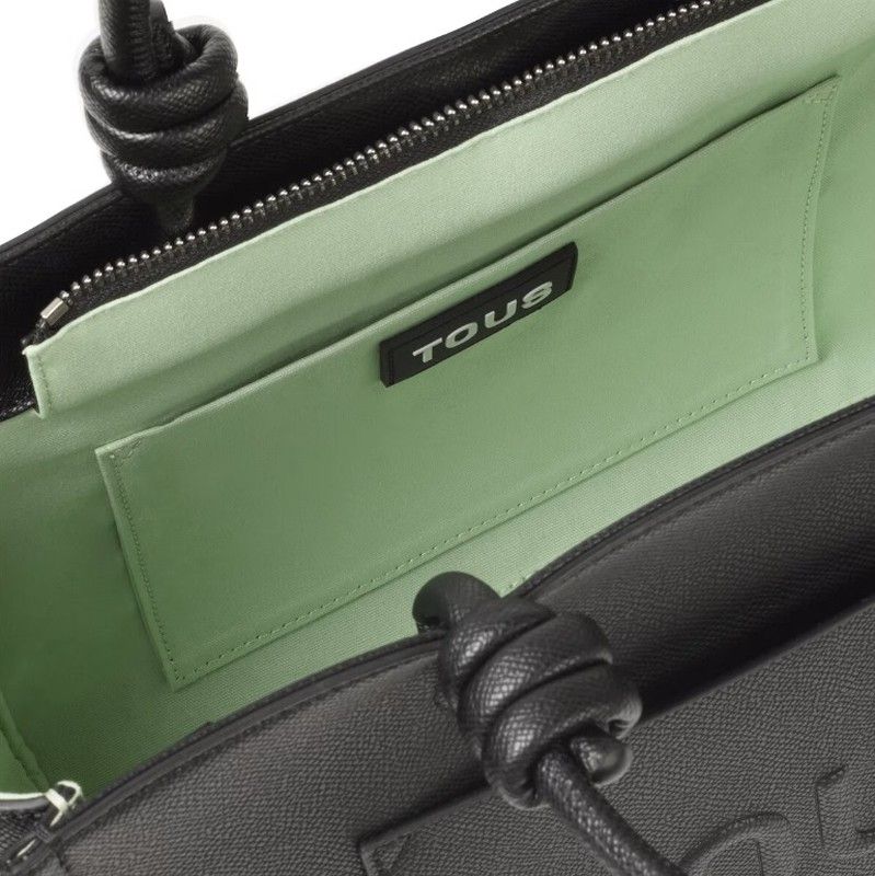 Tous mittelgroße Shopper-Tasche aus der Amaya La Rue New-Kollektion aus schwarzem Kunstleder. Als Neuheit gibt es diese Art von Taschen zunehmend mit Reißverschlüssen und offenen Innen- und Außentaschen. Es hat seinen charakteristischen Griff mit Knoten und einen weiteren abnehmbaren und verstellbaren Griff, um so bequem wie möglich zu sein.