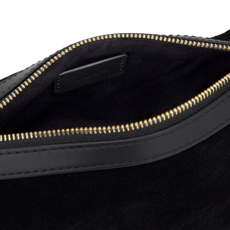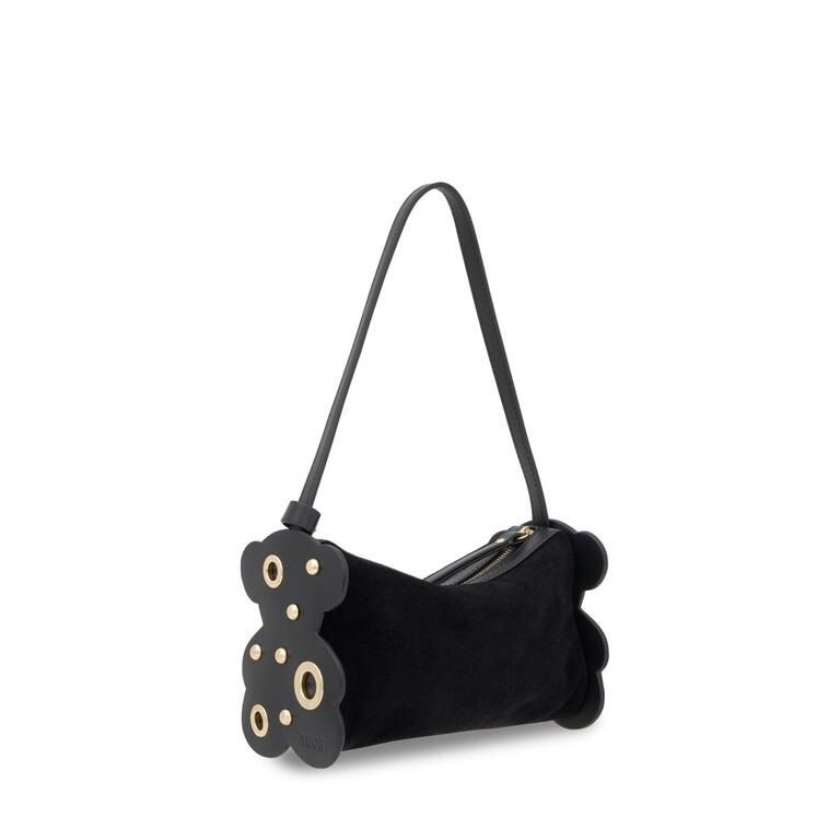 Die schwarze Tous-Schultertasche aus der Salsi-Kollektion mit goldenen Details besticht durch ihr markantes Tous-Bärenlogo an den Seiten, das der kompakten Tasche Charakter und Robustheit verleiht.