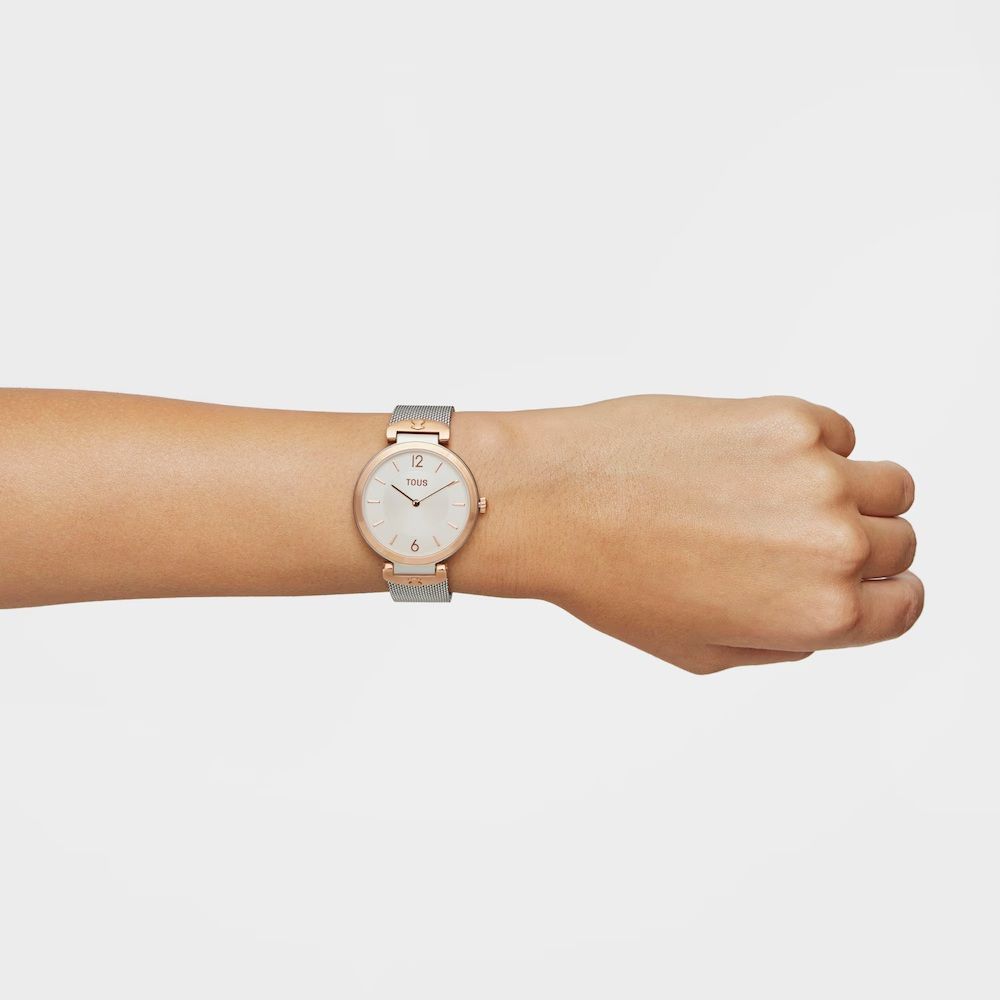 TOUS Damenuhr mit Gehäuse und Armband aus Stahl, Lünette aus rosa PVD. Mattes Armband mit Schiebeverschluss.